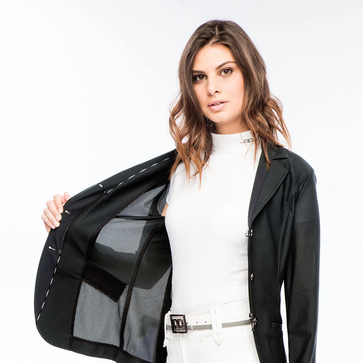 Horseware Ireland’s AA Platinum Motionlite Ladies Competition Jacket from the Alessandro Albanese Collection offers all the elegance and luxury of a tailor made jacket in an unparalleled, breathable, stretch, ready-to-wear competition show coat. This easy care, multi-discipline mesh jacket features an internal pocket, hidden zippers, and interchangeable buttons making it a must for your equestrian wardrobe.