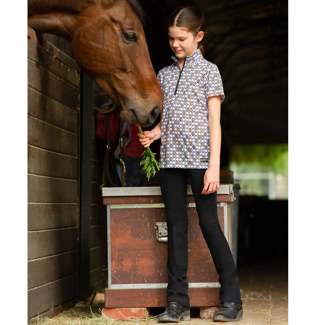 Kids Ice Fil Boot Cut Knee Patch Kids Breeches are designed to be worn year-round. The four-way comfort stretch technology along with the Ice Fil technologies ability to to cool the skins temperature up to 5 degrees make the breeches more desirable over others. Bootcut style makes them perfect for wearing in and out of the saddle.